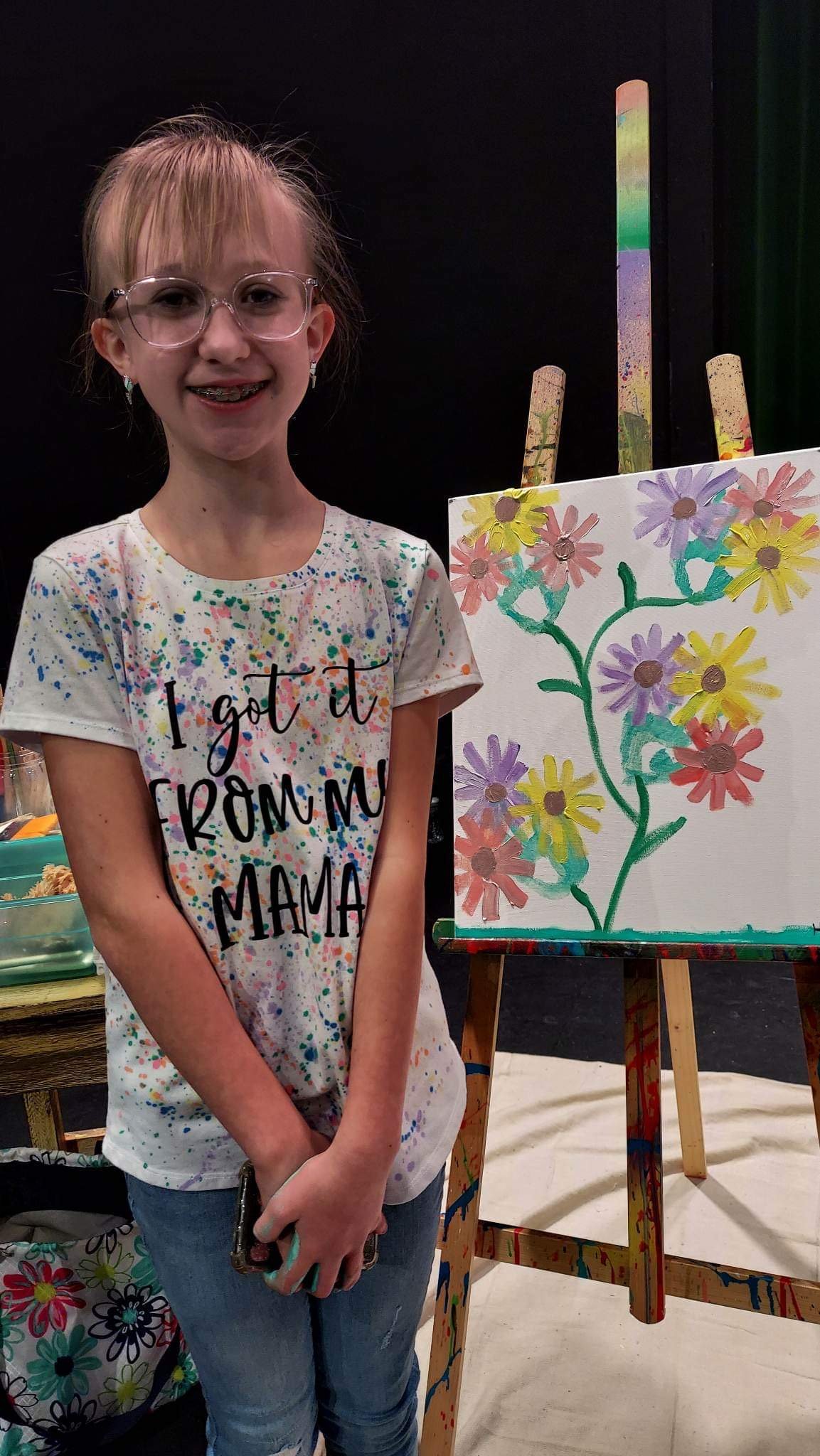 A young girl with glasses and braces standing next to a colorful flower painting on an easel, wearing a white t-shirt with paint splatters and text that reads 'I got it from my mama.'