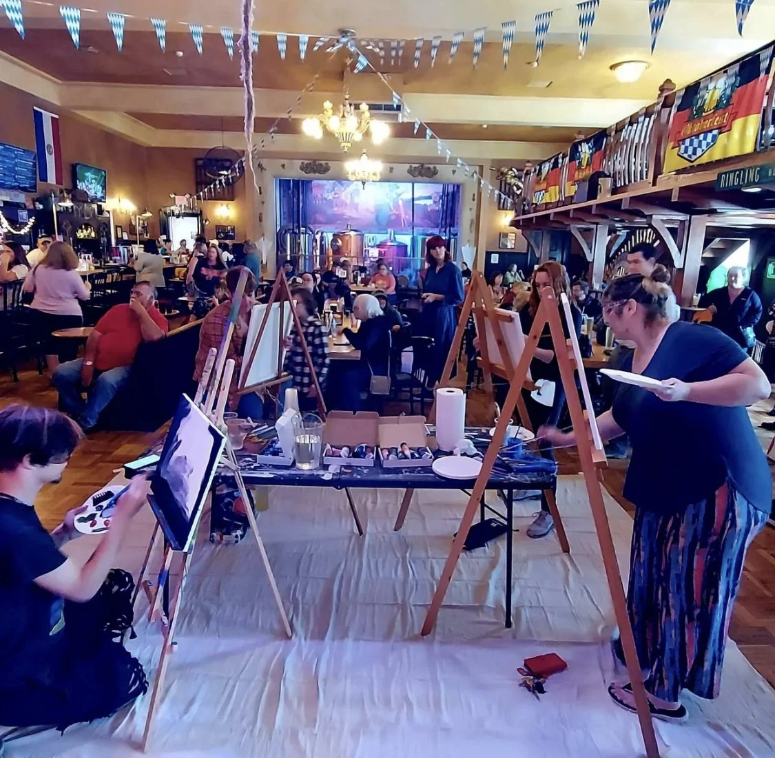 People painting on canvases set up on easels at an indoor art event in a decorated venue with wooden accents and flags.