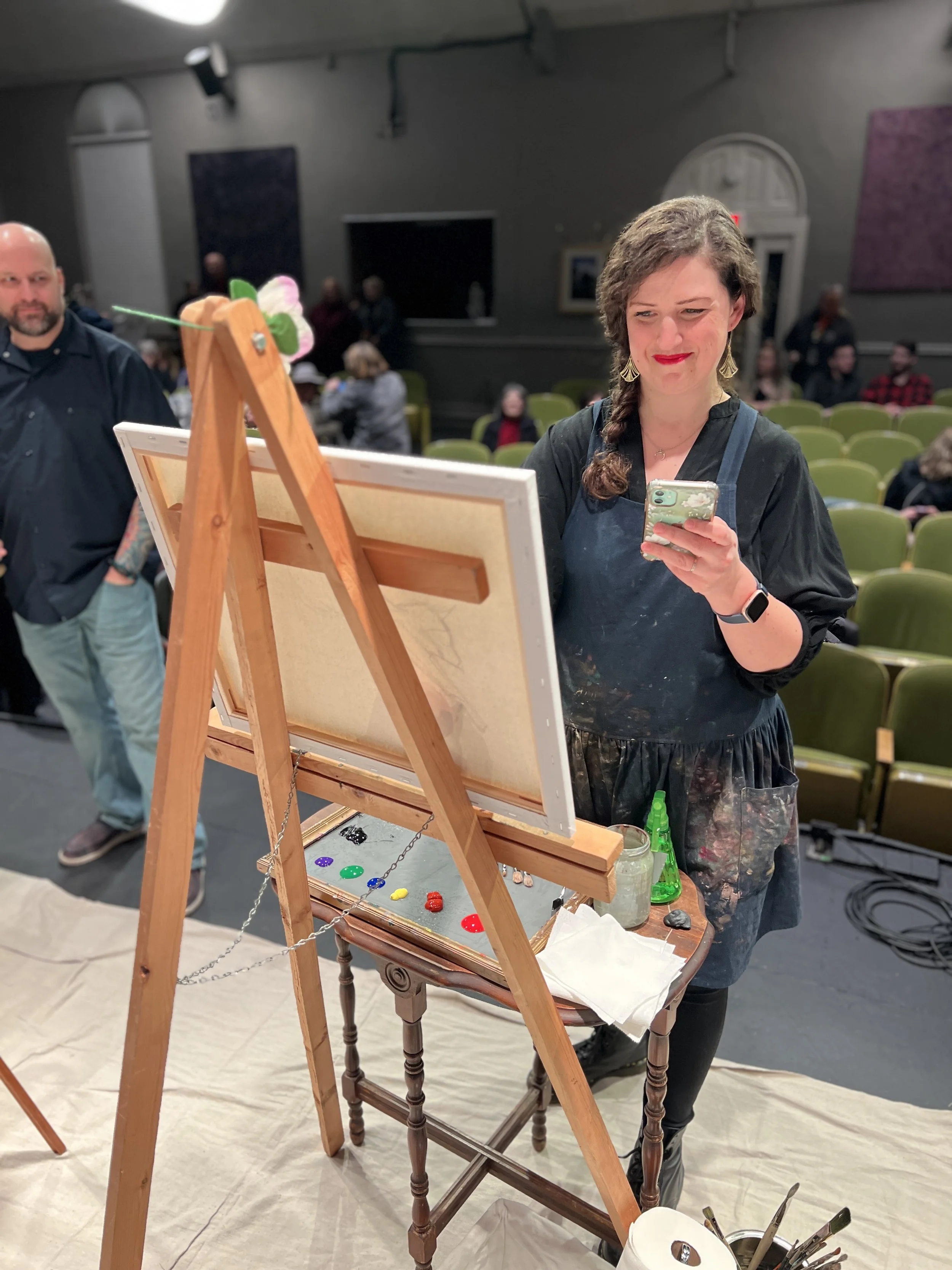 A woman artist in a black apron with paint stains looking at her phone at an art event with an easel, art supplies, and a canvas; people in the background seated in green chairs.