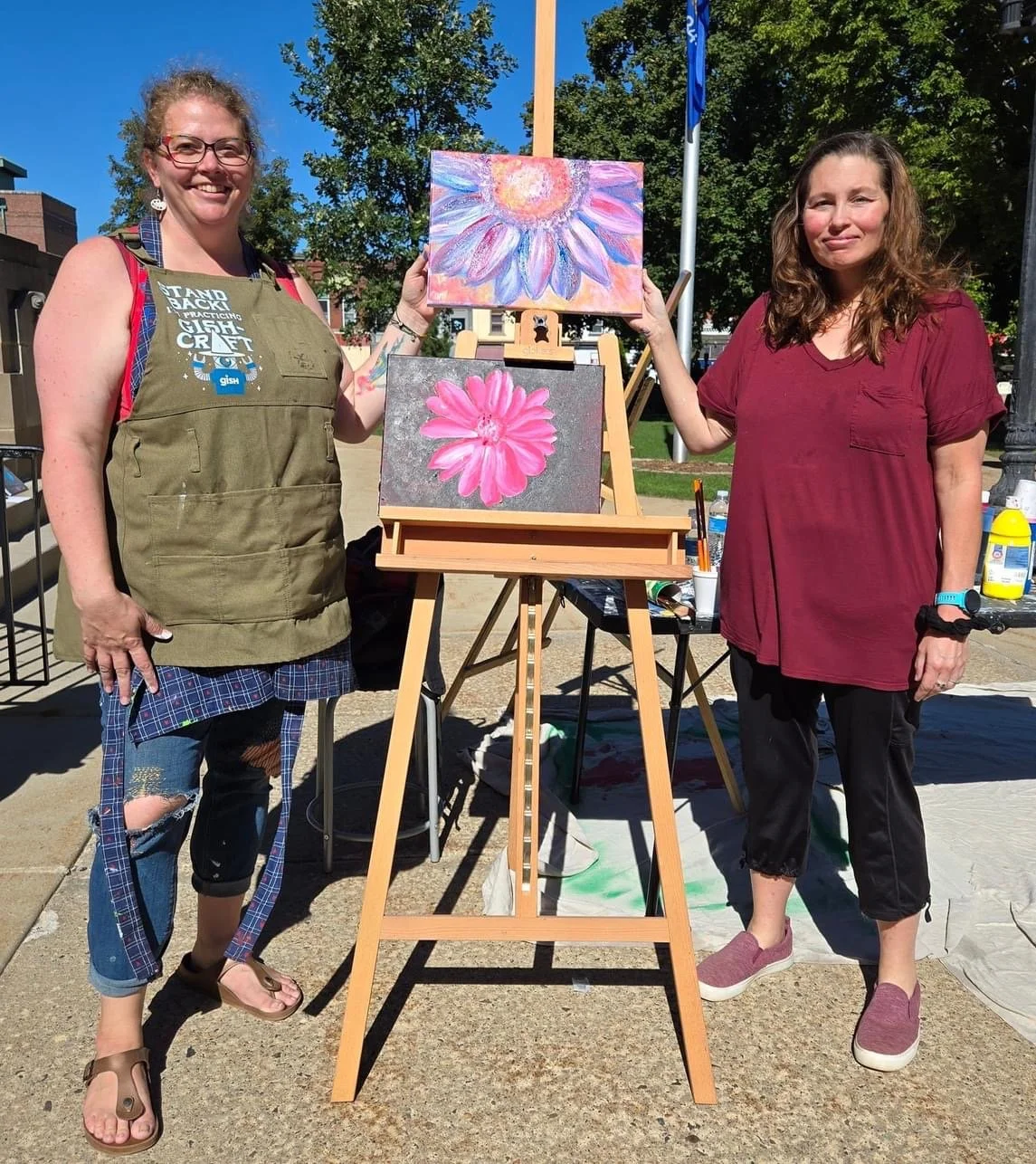Two women standing outdoors next to an easel with two paintings of pink flowers, smiling at the camera.