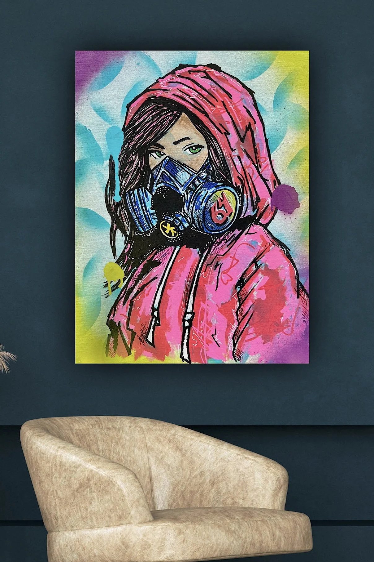 Colorful street art painting of a woman's face in a modern art style, with drips and graffiti elements, on a dark blue wall.